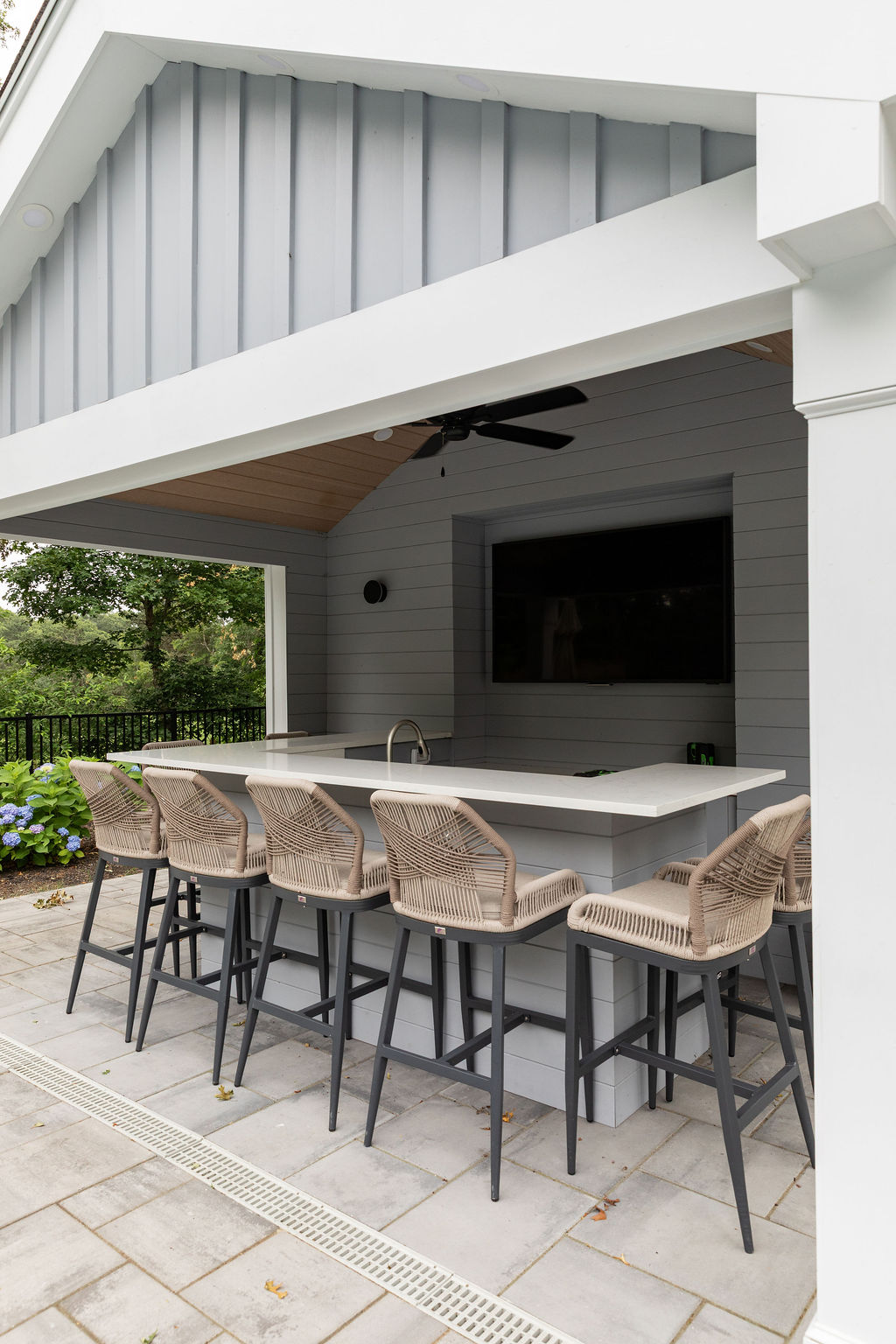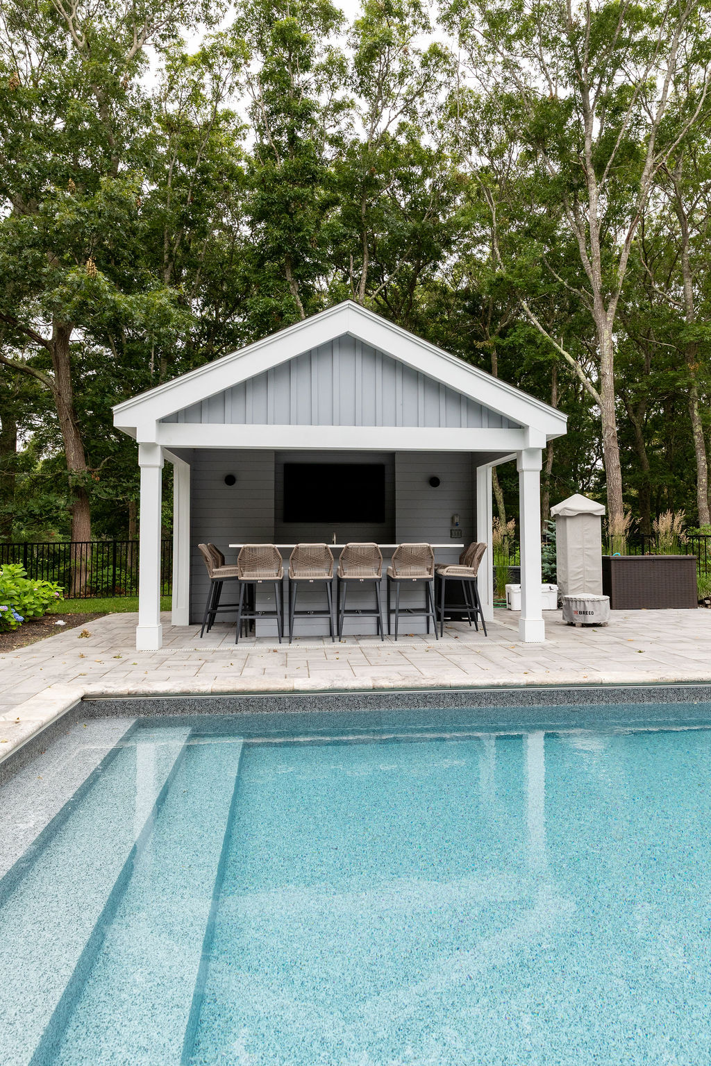 The open-air pavilion includes a fully plumbed outdoor bar with sink, generous seating, and a large wall-mounted television positioned for viewing from both the bar and the pool. An enclosed storage room and a dedicated bathroom are integrated on opposite sides of the structure, providing convenience while keeping pool equipment and utilities discreetly out of sight.