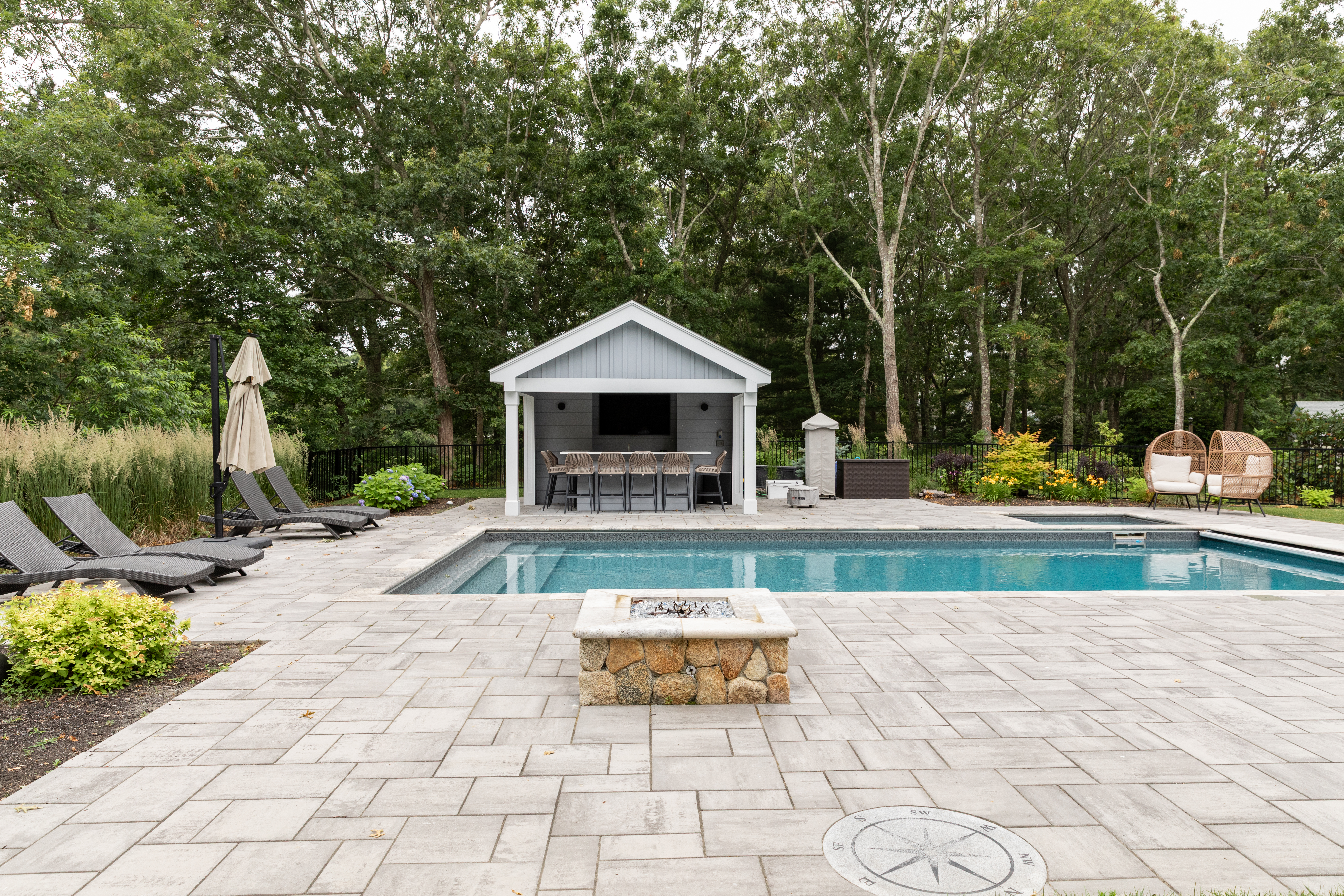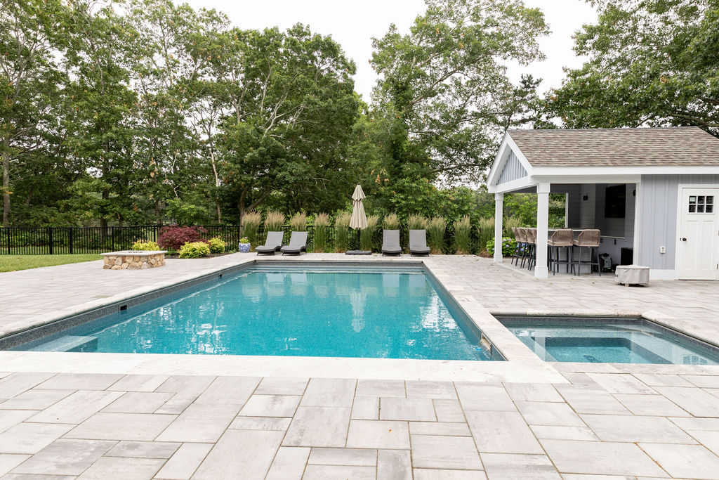 Carefully aligned with the pool and stone patio, the cabana enhances outdoor entertaining, improves circulation, and creates a seamless connection between architecture, landscape, and water—delivering a polished yet relaxed Cape Cod outdoor living experience.